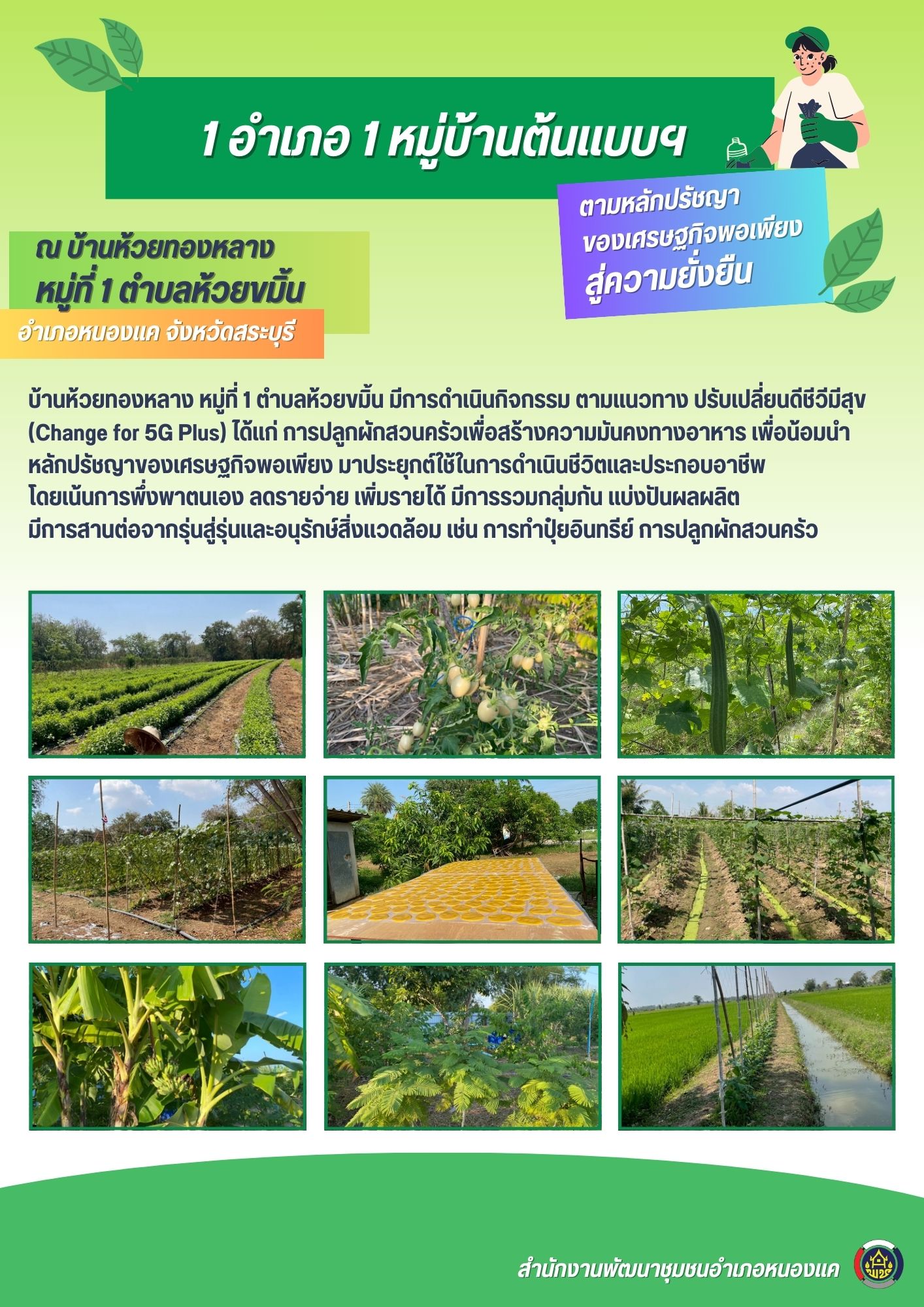 1 อำเภอ 1 หมู่บ้านต้นแบบ การน้อมนำแนวพระราชดำริฯ ปลูกผักสวนครัว เพื่อสร้างความมั่นคงทางอาหาร บ้านห้วยทองหลาง หมู่ที่ 1 ตำบลห้วยขมิ้น อำเภอหนองแค จังหวัดสระบุรี